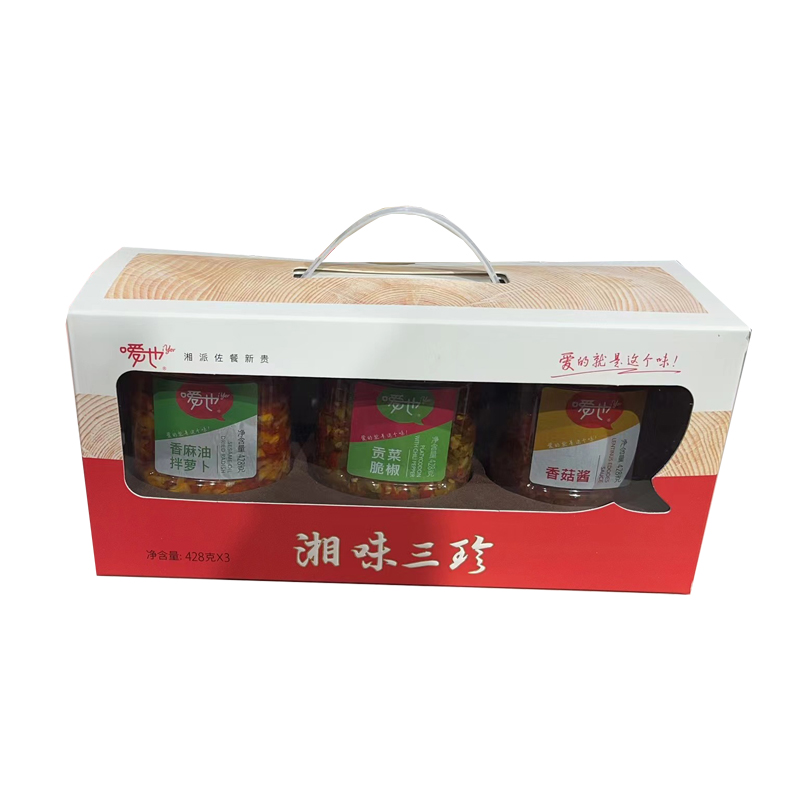 “嗳也”品牌系列产品采用安全、轻巧、便携的PP食品级包装,使得“嗳也”无论是在居家、旅游、野炊、商旅都能方便的伴你左右。“嗳也”产品浓浓的湘味,以及其轻巧方便邮寄的特征,不由得让人想起身在远方的亲友…… "
